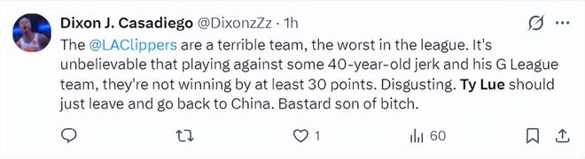 船蜜:快船真的糟糕透顶了, 面对一个41岁老头子代表的G联赛水准球队,他们竟然只赢了10多分,太恶心了,赶紧解雇泰伦卢吧,滚去中国执教吧,泰伦卢这个混蛋。